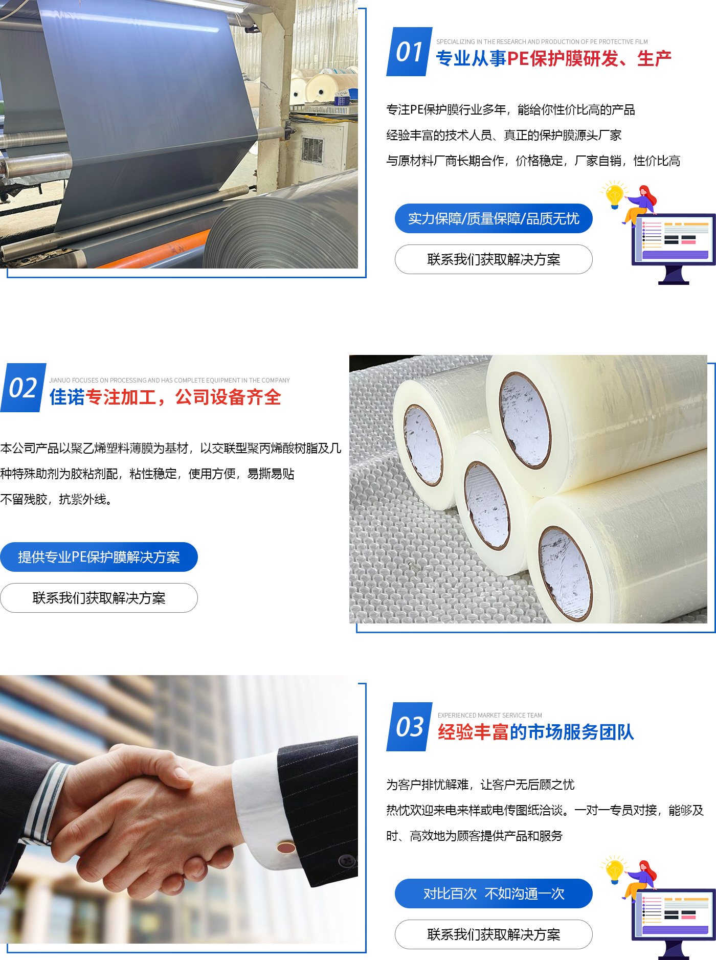 德州佳諾塑業(yè)有限公司生產(chǎn)防靜電自粘膜,包裝膜,筒子膜,原模,各種PE保護(hù)膜以及保護(hù)膜基材。公司生產(chǎn)保護(hù)膜、膠帶,是各類不銹鋼板、彩鋼板、鋁塑板、防火板、塑鋼型材、裝飾板、有機(jī)玻璃制品、漆面板、鏡面板、外墻板,保溫板,石英石,大理石,人造石,瓷磚,防盜門,木門,不銹鋼門窗,各種裝飾面板,各種建筑板材、地毯,以及電子、家用電器、家具、汽車制造,等行業(yè)不可缺少的表面保護(hù)材料。使被貼物在運(yùn)輸、加工、貯存和使用過程中不受污染、腐蝕、劃傷,保護(hù)原有的光潔亮澤的表面,從而提高產(chǎn)品質(zhì)量。 本公司產(chǎn)品用于鋁型材,PVC等材質(zhì)型材保護(hù)膜,鋁門等鋁制品保護(hù)膜,鋁塑板,不繡鋼,鋁合金等產(chǎn)品表面保護(hù)膜,保護(hù)其在運(yùn)輸途中,生產(chǎn),安裝時對產(chǎn)品表面所造成的刮傷,灰塵等。可用于,汽車門,木地板,冰箱表面等家電及電子產(chǎn)品表面的保護(hù)。 基材:PE材質(zhì) 粘性:低粘,中粘,高粘,特高粘 膜材:透明膜,藍(lán)膜,黑白膜,乳白膜 ( 除藍(lán)膜外,其...